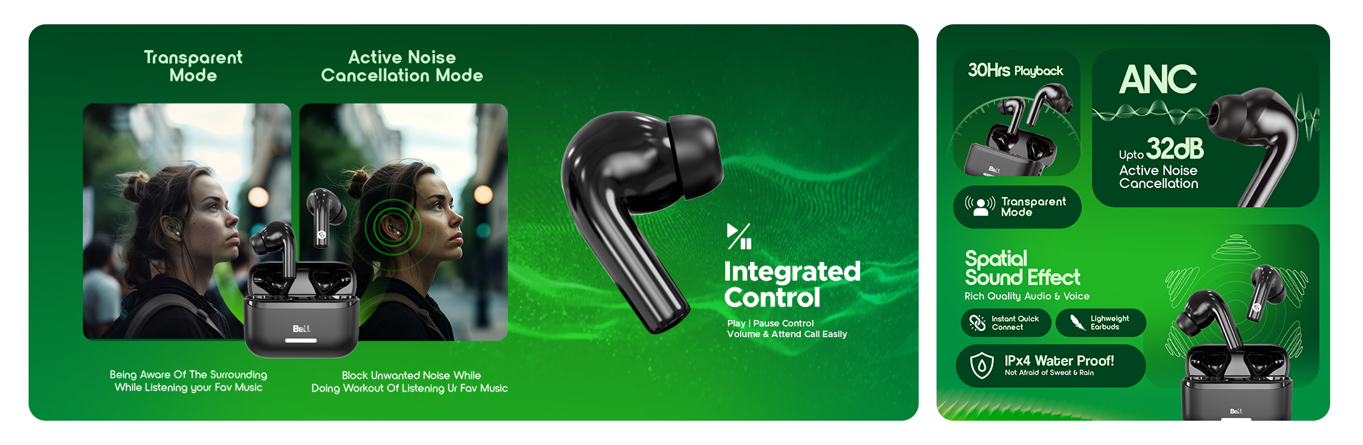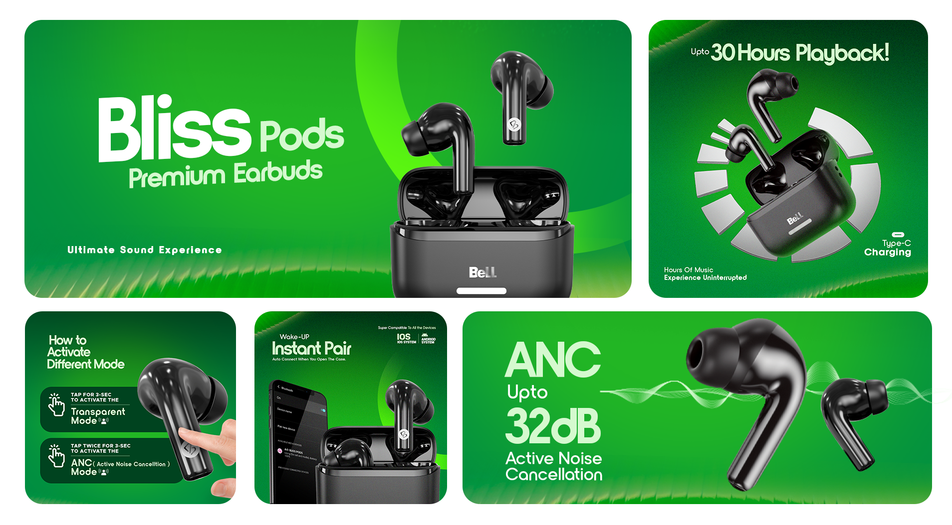 BeLL Bliss Pods – Black | 30H Playback, ANC up to 32dB, IPX4 Water-Resistant
